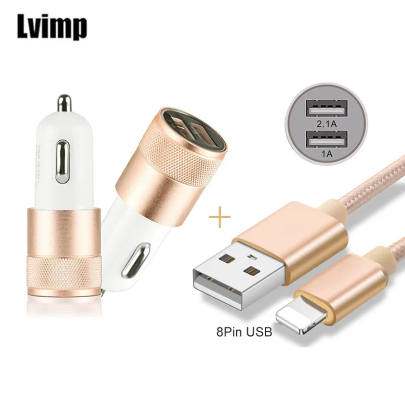 .Gallery of 2Port Smart USB Aluminum Car Charger Adapter + Nylon 8 Pin USB Cable for Apple iPhone Xr Xs Max 8 7 6s 6 Plus 5 5s 5c SE iOS 12